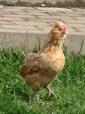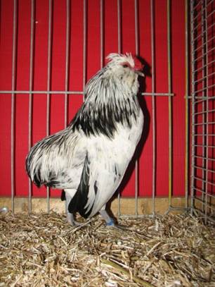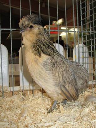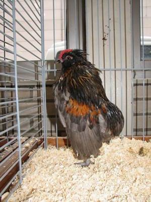 Vrij kort, breed tussen de schouders, naar achteren smaller wordend. Iets groot schijnend door de kuif, zonder schedelknobbel. Rozenkam, vrij kort, middelgroot, met driedelige doorn, welke tegen de kuif drukt, de middendoorn is de dikste en is iets langer, de buitendoorns zijn iets korter en dunner, fijn van weefsel; helderrood. Vrij kort; kleur al naar gelang de kleurslag. Vrij smal maar voldoende ontwikkeld; naar achteren gericht. Goed ontwikkeld, driedelig. Nauwelijks ontwikkeld, verborgen in de baard. Nagenoeg niet ontwikkeld en bedekt door de baard; wit. Groot, iets uitstaand; kleur al naar gelang de veerkleur. Nauwelijks middellang, sierlijk gebogen en vol bevederd; halsbehang flink ontwikkeld, de schouders goed bedekkend en manen vormend in de nek. Aflopend naar achteren; middellang, korter tonend door het grotendeels schuilgaan onder het zadelbehang. Geboren en iets naar voren gedragen. Middellang, naar beneden gericht; aan het einde naar binnen gebogen. Vrij breed. Ontbreekt geheel Wordt afgedekt door de zadelveren. Middellang, vrij aangesloten bevederd. Middellang, fijn, glad; vier tenen; kleur al naar gelang de kleurslag. Glad aanliggend. |
