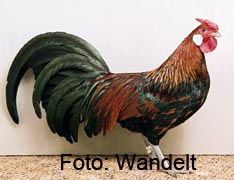 Kleurslagen: Goud zwartgeloverd: Kleur en tekening van haan en hen, zoals aangegeven onder nr. 82 van de Alg. Kleurbeschrijving. Loopbenen en tenen: leiblauw, voetzolen: licht. Snavel: blauwachtig donker hoornkleurig. Ogen: bruinrood. Zilver zwartgeloverd: Kleur en tekening van haan en hen, zoals aangegeven onder nr. 83 van de Alg. Kleurbeschrijving. Loopbenen en tenen: leiblauw, voetzolen: licht. Snavel: blauwachtig hoornkleurig. Ogen: bruinrood. Goudpel Ogen: oranjeachtig roodbruin. Snavel: blauwachtig donker hoornkleurig. Loopbenen en tenen: leiblauw, voetzolen: licht. Kleur en tekening van de haan Kop: goudbruin. Hals: halsbehang glanzend levendig goudbruin; veren van de voorzijde van de hals overeen-komstig die van de borst. Borst, buik en dijen: warm goudbruin, de flankveren vertonen enige zwarte peltekening. Vleugels: schouders glanzend goudbruin; vleugelband goudbruin, binnenvaan van de vleugelbandveren zwak getekend met overdwarse streepjes; Grote slagpennen: binnenvaan zwart, buitenvaan goudbruin; Kleine slagpennen: binnenvaan goudbruin, overdwars getekend met zwarte, iets groenachtig glanzende streepjes, buitenvaan goudbruin, behalve aan de punt, waar de peltekening doorloopt. Rug en zadel: glanzend warm goudbruin. Staart: stuurveren zwart; sikkels en staartdekveren groenglanzend zwart met een smalle, scherp begrensde goudbruine omzoming. Achterdeel: zwartachtig grijs met bruine aanslag. Donskleur: blauwgrijs. Ernstige fouten Sterk ongelijkmatige grondkleur; te lichte grondkleur; te donker in hals- en zadelbehang en schouders; te brede of zeer onregelmatige omzoming van sikkels of staartdekveren; ontbreken van sikkelomzoming; bronskleurige gloed in de sikkels. Fouten Bovenstaande ernstige fouten in mindere mate voorkomend. Kleur en tekening van de hen Kop: warm goudgeel. Hals: halskraag warm goudgeel, enige peltekening geheel onderaan in de kraag toegestaan; ve-ren aan de voorzijde van de hals overeenkomstig die van de borst doch iets minder krachtig overdwars getekend. Borst: warm goudgeel, iedere veer duidelijk recht overdwars getekend met fijne groenzwarte streepjes, ongeveer even breed als die van de grondkleur van de veer. De tekening moet naar boven toe zoveel mogelijk hetzelfde karakter behouden en niet te sterk verzwakken. Vleugels: vleugeldekveren en vleugelbanden levendig warm goudgeel, iedere veer fijn en recht overdwars getekend met groenzwarte streepjes, iets breder dan de tussenliggende streepjes van de grondkleur; Grote en kleine slagpennen: warm goudgeel, fijn en recht overdwars getekend met groenzwarte streepjes, iets breder dan de tussenliggende streepjes van de grondkleur. Rug: warm goudgeel, iedere veer fijn en recht overdwars getekend met groenzwarte streepjes, iets breder dan de tussenliggende streepjes van de grondkleur. Staart: stuurveren warm goudgeel; iedere veer tamelijk fijn en recht overdwars getekend met groenzwarte streepjes, iets breder dan de tussenliggende streepjes van de grondkleur; staartdekveren warm goudgeel; iedere veer fijn en recht overdwars getekend met groenzwarte streepjes, iets breder dan de tussenliggende streepjes van de grondkleur. Buik en dijen: warm goudgeel met zwarte pepering of tekening. Donskleur: blauwgrijs. Ernstige fouten Veel te lichte of veel te donkere grondkleur of ongelijke grondkleur; grove of zeer onregelmatige peltekening; onvoldoende kleurdiepte en scherpte van de tekening; onvoldoende peltekening in de borst; te hoog in de halskraag oplopende peltekening. Fouten Bovenstaande ernstige fouten in mindere mate aanwezig; grondkleur in de peltekening.