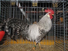 Tamelijk slank met brede schoudersen smaller toelopend naar de staart. Breed en krachtig in overeenstemming met de kam; gezicht levendig rood. Enkelkammig: rechtopstaand, middelgroot, voorzien van 5 of 6 diep en gelijk ingesneden, van onderen brede en van boven spits toelopende kamtanden, welke onderling een goede verhouding vertonen; fijn van weefsel. De kam steekt van voren niet over de snavel, terwijk de kamhiel, welke flink ontwik-keld is, de schedel niet raakt, doch wel gedeeltelijk de ronding van de nek volgt; levendig rood. Rozenkammig: van voren vrij breed, naar achteren spits toelopend, in een goed ontwikkelde ronde doorn eindigend, die in een horizontale richting over de achterkop steekt. Hetbovenvlak is met vele kleine en niet hoge, goed afgeronde puntjes bezet (werk). Middellang, stevig, aan de punt iets gebogen; geel, hoornachtige aanslag aan de bovensnavel bij donkergekleurde variëteiten toegestaan. Lang, dun en fijn van weefsel, van onderen goed afgerond; levendig rood. Amandelvormig of ovaal, middelgroot, glad aanliggeend, zacht glanzend en glad van oppervlakte; wit, roomkleur toegestaan. Vrij groot, levendig oranjerood. Vrij lang, sierlijk gebogen; flink ontwikkelde, lange, volle en glanzende hals-bevedering. Lang en recht, breed tussen de schouders, smaller wordend en aflopend naar de staart; breed in zadel, rijk bevederd. Breed en vol, goed gerond en naar voren gedragen. Groot, middellang, krachtig, goed opgetrokken en aangesloten tegen het lichaam gedragen. Breed en gerond. Groot, lang, vol bevederd, niet waaiervormig, doch enigszins samengevou-wen gedragen, een stompe hoek met de rug vormend; de sikkels en staart-dekveren zijn goed ontwikkeld. Goed gerond. Vrij lang, goed zichtbaar, stevig, doch niet te zwaar, goed uit elkaar geplaatst. Vrij lang en krachtig, glad geschubd en vrijwel evenwijdig aan elkaar geplaatst; geel tot oranjegeel; vier tenen. Glad aanliggend, vol en glanzend. |