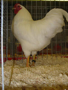Lang, matig diep, enigszins afgerond rechthoekig. Horizontale houding. Middelgroot, middellang, met voldoende breedte, vrij diep, van boven meer vlak dan rond; gezicht levendig rood. Enkelkammig: middelgroot, stevig en vrij breed aan de basis, recht en rechtop met 5 regelmatige, goed gevormde kampunten, de voorste en de achterste kleiner dan die in het midden; kamhiel glad, enigszins de buiging van de nek volgend, zonder deze te dicht te naderen; helderrood. Rozenkammig: middelgroot, vrij laag en stevig aan de basis, ovaal, bedekt met fijn werk, eindigend in een ronde doorn, welke iets naar beneden buigt zonder de buiging van de kop te dicht te volgen; helderrood. Middellang, licht gebogen; roodachtig hoornkleurig. Middelgroot, fijn van weefsel; helderrood. Langwerpig, glad, fijn van weefsel; levendig rood. Groot, vol, levendig; roodachtig bruin. Middellang, enigszins naar voren gedragen; halsbehang rijk ontwikkeld, flink over de schouders vallend. Rug lang, matig breed over de gehele lengte, horizontaal gedragen; zadel matig breed; zadelbehang middellang en overvloedig, geleidelijk overgaande in de staartpartij. Matig diep, vol, goed gerond. Kort en vrijwel horizontaal gedragen; mogen niet voorbij het lichaam steken; grote en kleine slagpennen breed. Breed en gerond. Middellang, goed gespreid gedragen onder een hoek van 20 graden met de grond; staartstuurveren breed, hoofd-, bijsikkels en staartdekveren middel-lang en de staartstuurveren goed afdekken. Vrij vol. Fors, middellang, goed uit elkaar en evenwijdig aan elkaar geplaatst. Middellang, glad, warm geel met een zweem van roodachtig hoornkleurige tint, vier tenen; warm geel. Een rode kleur langs de zijden van het loopbeen tot aan de punten van de tenen is gewenst. Goed aangesloten, vrij volle donspartij; brede veerstructuur. |