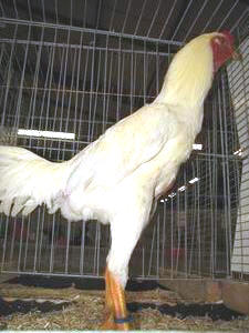 Breed van voren, naar achteren smaller wordend, opgericht gedragen. Middellang, zeer breed, schedel sterk gewelfd, zware wenkbrauwen, waardoor de ogen diep in de oogkassen liggen. Kleine erwtenkam, die op het voorhoofd geplaatst is met een korte doorn, die de neklijn volgt; rood. Kort, zeer stevig, sterk gekromd; geel of hoornkleurig. Zeer klein of ontbreken geheel. Sterk ontwikkelde, naakte keelwam die tot de bovenhals reikt. Zeer klein; rood. Parelwit tot oranjegeel. Zeer lang en soepel, wordt rechtop, slechts weinig gebogen gedragen; halsbehang kort en spaarzaam ontwikkeld, omsluit alleen de bovenhals van achteren en opzij, bereikt de schouders niet. Bevedering vormt een zgn. stierennek. Breed, lang en vlak; zadelbehang spaarzaam en zeer kort. Breed, weinig naar voren gedragen; hals, borst en dijen vormen een vrijwel rechte, verticale lijn. Groot, niet voorbij het lichaam stekend, goed aangesloten gedragen. Breed, hoekig en hoog aangezet en wat uitstaand gedragen, zeer spaarzaam bevederd, waardoor de huid zichtbaar is op het schoudergewricht. Nauwelijks middellang, enigszins samengevouwen en afhangend gedragen; sikkels matig ontwikkeld, vrij smal en weinig gebogen. Weinig ontwikkeld, goed opgetrokken, kort dons. Ruim middellang, goed uit elkaar geplaatst, zwaar bespierd, treden vrijwel over hun gehele lengte uit de buikbevedering tevoorschijn. Ruim middellang, zeer krachtig, fijn geschubd; vier tenen, geel, de achterteen relatief klein en goed naar achteren geplaatst; rechte sporen. Zeer hard en krap, goed aansluitend. |