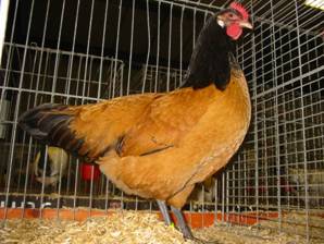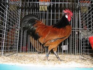 Vrij breed en diep; min of meer rechthoekig. Middelgroot; gezicht rood. Enkel, recht en rechtop, middelgroot, 4 tot 6 kamtanden, regelmatig en niet te diep ingesneden, kamhiel iets oplopend naar achteren, fijn van weefsel; helderrood. Middellang; donker blauwgrijs tot hoornkleurig. Middellang, goed gerond, fijn van weefsel; helderrood. Nauwelijks middelgroot, ovaal, vlak aanliggend, wit (iets rood in de randen is toegestaan). Levendig, geelachtig rood. Middellang, halsbehang goed ontwikkeld. Breed, iets aflopend naar de staart; zadelbehang goed ontwikkeld. Breed, goed gewelfd, vrij diep. Middelgroot, goed aanliggend gedragen, zonder af te hangen. Vrij breed. Matig gespreid, middelhoog gedragen, sikkels middellang, fraai gebogen; staartdekveren goed ontwikkeld. Donspartij matig ontwikkeld. Recht en voldoende uit elkaar onder het lichaam geplaatst; nauwelijks middellang, krachtig, voor een deel uit de bevedering naar voren tredend, gesloten bevederd. Middellang, fijn gebouwd, glad geschubd; leiblauw. Vier tenen, leiblauw. Vol, glad aanliggend. |