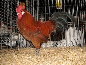 Breed vrij diep, naar achteren iets smaller wordend. Middelgroot, iets langwerpig; gezicht rood, dun bezet met fijne haarachtige veertjes. Enkel, middelgroot, niet te hoog; gelijkmatig en niet te diep ingesneden, 5 of kamtanden, fijn van weefsel;recht en rechtop geplaatst, helderrood. De kam-hiel volgt niet de buiging van de nek, doch loopt vrijwel horizontaal naar achteren Kort en krachtig, slechts iets gebogen aan de punt; blauw of licht hoornkleurig blauw. Nauwelijks middellang, bij de hen vrij kort, dun en fijn van weefsel, goed gerond; helderrood. Ovaal middelgroot, bij de hen vrij klein; wit. Vrij groot met levendige uitdrukking; donkerbruin. Middellang, licht gebogen doch opgericht gedragen; naar de kop iets dunner wordend, halsbevedering flink ontwikkeld, de voorzijde van de hals, schouders en rug ten dele bedekkend. Breed en middellang, flauw aflopend naar de staart en met een kortronde hoek overgaande in de staartpartij; het zadelbehang bij de haan breed en zo rijk ontwikkeld, dat de vleugelpunten er onder schuil gaan. Breed en vol, iets naar voren gedragen. Krachtig en vrij lang, goed gesloten gedragen en rustend op het gevederte van de flanken. Breed. Goed ontwikkeld. De stuurveren breed en tamelijk gespreid gedragen; sikkelveren breed en fraai gebogen; staartdekveren talrijk. Diep en vol Nauwelijks middellang en vrij stevig; aangesloten bevederd. Evenwijdig, recht en breed onder het lichaam geplaatst; onbevederd; leiblauw; vier tenen. Goed ontwikkeld met rijke sierveren. |