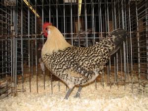 Kleurslagen: Noot Ten aanzien van de peltekening bij de Groninger meeuwkrielen wordt opgemerkt, dat de peltekening gevormd wordt door aan weerszijden van de veerschacht paarsgewijs liggende, min of meer blokvormige pelvlekjes of dopjes, 2 of 3 aan iedere zijde van de schacht, waarvan alleen de bovenste paren zichtbaar zijn. Deze pelvlekjes liggen geheel vrij en dienen noch de schacht, noch de veerrand te raken. Bij de haan zijn de sikkels echter ongezoomd. Aan de staartdekveren is slechts enige omzoming toegestaan. Een zwart randje aan de onderste rij veren van de vleugelband wordt als raskenmerk beschouwd. Goudpel: Kleur en tekening van haan en hen, zoals aangegeven onder nr. 77 van de Alg. Kleurbeschrijving, met uitzondering van de slagpennen. Bij de haan: Grote slagpennen: buitenvaan goudbruin met enige zwarte tekening naar het einde van de veer; binnenvaan goudbruin krachtig doormengd met zwart. Kleine slagpennen: buitenvaan goudbruin; binnenvaan goudbruin, krachtig doormengd met zwart. Bij de hen: Grote slagpennen: buitenvaan goudgeel met enige zwarte tekening; binnenvaan goudgeel krachtig doormengd met zwart, vervagend naar de verrand. Kleine slagpennen: buitenvaan goudgeel met grove zwarte peltekening; binnenvaan goudgeel met grove onregelmatige peltekening, die overgaat in min of meer overlangse strepen. Zilverpel: Kleur en tekening van haan en hen, zoals aangegeven onder nr. 78 van de Alg. Kleurbeschrijving, met bij de haan en hen dezelfde tekening in de grote en kleine slagpennen als omschreven bij de goudpel. Citroenpel: Kleur en tekening van haan en hen, zoals aangegeven onder nr. 79 van de Alg. Kleurbeschrijving, met bij de haan en hen dezelfde tekening in de grote en kleine slagpennen als omschreven bij de goudpel. Ernstige tekeningsfouten Zoals omschreven bij de genoemde kleurslagen in de Alg. Kleurbeschrijving; bovendien bij de haan peltekening in de borst, hals- en zadelbehang; sikkelveeromzoming. Bij de hen te zware of te fijne peltekening of te hoog aan de borst oplopende peltekening en peltekening in de halskraag; ongetekende staartstuurveren.. Fouten Zoals omschreven bij de genoemde kleurslagen in de Alg. Kleurbeschrijving; bovendien boven-staande ernstige fouten in mindere mate voorkomend. |