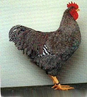 Kleurslagen: Gestreept: Kleur en tekening van haan en hen: beide vanen van iedere veer over de gehele lengte daarvan, regelmatig en scherp overdwars gestreept door evenwijdig aan elkaar lopende, afwisselende licht (slechts weinig donkerder dan wit) en donker (slechts weinig afwijkend van positief zwart) van kleur, eindigende in een smalle zwarte tip. De donkere en lichte banden in ieder veergedeelte van de haan moeten ongeveer gelijk van breedte zijn en wel tamelijk smal, behalve in de slagpennen en staartstuurveren, welke een iets bredere streeptekening hebben als gevolg van de bredere veer. Daarentegen zijn de dwarsstrepen in hals- en zadelbehang anderzijds nog smaller dan in het overige gevederte, als gevolg van de geringe breedte van de veren. De lichte banden in de veren van de hen zijn tamelijk smal en de donkere banden ongeveer tweemaal zo breed als de lichte. Evenals bij de haan voeren de slagpennen en staartstuurveren een bredere bandtekening. Veel waarde wordt gehecht aan recht en scherp begrensde banden, zonder donkere overvloeiing in de lichte banden, noch afwijkende schachtkleur (deze is namelijk overeenkomstig de lichte en donkere banden op dezelfde wijze in licht en donker onderbroken). Door het over elkaar liggen van de veren, waarbij de donkere banden van het afgedekte gedeelte van de veren iets doorschijnen, wordt aan het dier een blauwachtige tint gegeven, wanneer op enige afstand bezien. Donskleur in alle veergroepen: dezelfde als die van het bovengevederte, doch niet zo duidelijk en zo scherp als gevolg van de geringe vastheid van de baardharen. Ernstige fouten: Verkeerde of onregelmatige tekening; te donkere of te roestachtige streping; onscherpte of onzuiverheid van de donkere banden; voorkomen van geheel zwarte of gedeeltelijk zwarte veren; wit in het gevederte; niet recht over de veer lopende banden; ontbreken van een harmonieuze kleurgelijkheid over het gehele gevederte; onvoldoende bandtekening in het dons; kuikenveren in vleugels en staartbevedering. Fouten: Bovenstaande ernstige fouten in mindere mate voorkomend; te veel donkere gloed in de grote loopbeenschubben bij de hen. Noot: Bij de gestreepte Plymouth Rockhanen mag de sierveerontwikkeling in broek en dijen niet als fout worden aangemerkt. Het aanwezig zijn van sierveren aan de voorzijde van de dijen is echter wel een fout. Wit: Kleur van haan en hen zoals aangegeven onder nr. 98 van de Alg. Kleurbeschrijving. Snavel geel. Zwart: Kleur van haan en hen zoals aangegeven onder nr. 99 van de Alg. Kleurbeschrijving. Snavel geel, enige donkere aanslag toegestaan, eveneens op de loopbenen van de hen. Buff: Kleur van haan en hen zoals aangegeven onder nr. 103 van de Alg. Kleurbeschrijving. Snavel geel. Meerzomig patrijs: Kleur van haan en hen zoals aangegeven onder nr. 23 van de Alg. Kleurbeschrijving. Snavel donker hoornkleurig, overgaand in geel aan de punt. Meerzomig zilverpatrijs: Kleur van haan en hen zoals aangegeven onder nr. 25 van de Alg. Kleurbeschrijving. Snavel donker hoornkleurig, overgaand in geel aan de punt. Wit zwartcolumbia: Kleur van haan en hen zoals aangegeven onder nr. 61 van de Alg. Kleurbeschrijving. Met dien verstande, dat bij de haan geringe zadeltekening is toegestaan. Snavel geel, donkere streep op bovensnavel toegestaan. Buff zwartcolumbia: Kleur van haan en hen zoals aangegeven onder nr. 64 van de Alg. Kleurbeschrijving. Met dien verstande, dat bij de haan geringe zadeltekening is toegestaan. Snavel geel, donkere streep op bovensnavel toegestaan. Blauw (ongezoomd): Kleur van haan en hen zoals aangegeven onder nr. 100 van de Alg. Kleurbeschrijving. Snavel geel, iets aanslag toegestaan. |