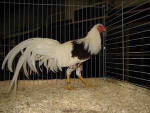 Vrij lang, iets afhellend naar de staart. Middelgroot, langgerekt, vlak, niet te bereed; levendig rood. Kussenkam zonder doorn; klein, laag op de kop geplaatst; fijn van weefsel; levendig rood. Middellang, stevig, gebogen; geel. Klein, zodat het onderste gedeelte van de keelwam even zichtbaar wordt; fijn van weefsel; levendig rood. Klein, kort; levendig rood. Levendig; rood. Lang, slank, vooral van boven; halsbehang lang en smal, de schouders ruim bedekkend. Rug lang, iets aflopend naar de staart; zadel voorzien van zeer rijk ontwikkeld afhangend siergevederte. Hooggedragen, gerond. Lang en krachtig, enigszins afhangend, doch goed aangetrokken aan de flanken gedragen; vleugeldekveren rijk ontwikkeld doch vlak aanliggend; grote en kleine slagpennen breed. Afgerond, matig breed. Zo rijk mogelijk bevederd en zo lang mogelijk; ongeveer horizontaal gedra-gen; sikkels zeer lang, smal; schachten van de sikkels voldoende krachtig, zodat deze eerst nog een stuk achterwaarts staan alvorens naar beneden te buigen in een fraaie boog en slechts met het veereinde over de grond slepen staartdekveren zeer lang, smal, tot de grond reikend; sikkels, staartdekveren en zadelbehangveren een fraai aaneensluitend geheel vormend; staartstuur-veren lang en breed, een weinig gebogen. Matig ontwikkeld, evenals de donspartij. Ruim middellang, aangesloten bevederd, slank. Voldoende uit elkaar geplaatst en van voren gezien recht, iets meer dan middellang, fijn van bouw met glad aanliggende schubben, 4 lange tenen; geel. Rijk ontwikkeld, alle veren dienen zo lang mogelijk te zijn; sierveren naar, verhouding, smal; door de geringe donsontwikkeling ligt het gevederte vlak aan. |