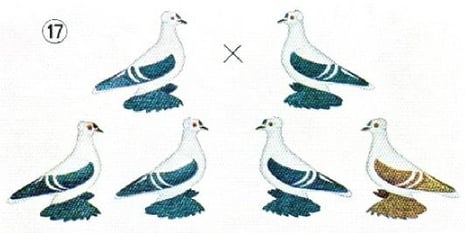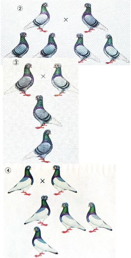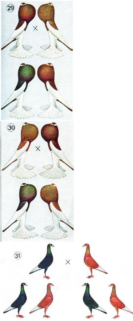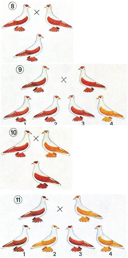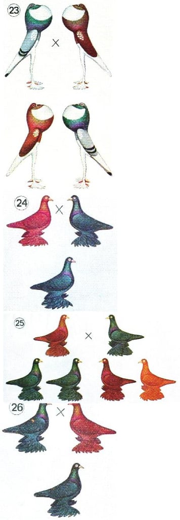 Alvorens de lezer zich stort in de meer ingewikkelde materie betreffende de erfelijke gedragingen van kleuren bij duiven, is het raadzaam de schema’s 8 -13 nogmaals goed te bestuderen, zodat de duivenfokker-lezer tenslotte volledig uit het hoofd de uitkomsten van deze 6 paringen kan opzeggen en verklaren. Een soort examen dus, waarmee u echter eer inlegt bij besprekingen met collega fokkers, op de tentoonstellingen, bijeenkomsten en in uw eigen volière!