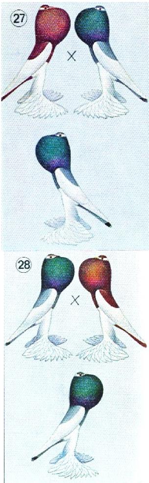 Fokonzuivere, zwarte doffer x sierduifrode duivin geeft zwarte nafok in beide geslachten; zie schema 26, en vergelijk dit met schema 14.