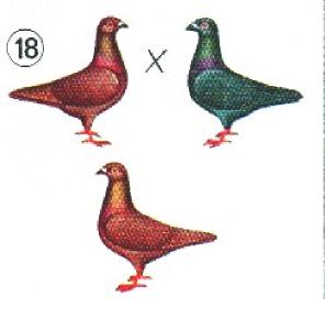 Fokonzuivere, postduifrode doffer x zwarte duivin geeft Zwarte en rode doffers en zwarte en rode duivinnen; beide kleuren dus in beide geslachten, zie schema 19.