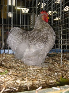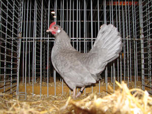 · Kleur en tekening van de haan Elke veer is op een parelgrijze grondkleur, drie of viermaal licht boogvormig overdwars onderbroken door een vrijwel witte tekening, die niet scherp begrensd is. In de sierveren is het aantal dwarsbanden groter naar verhouding tot de lengte van de veer. In die veren, doch het meest in het hals- en zadelbehang, neigt de tekening naar een omgekeerde V. De koekoektekening moet over het gehele lichaamduidelijk waarneembaar en zo gelijkmatig mogelijk zijn. De donskleur is licht parelgrijs. · Kleur en tekening van de hen De hen is over het algemeen getekend als de haan, doch toont een minder duidelijk waarneembare tekening. De donskleur is licht parelgrijs. ü Ernstige fouten Anders gekleurde veren; te lichte grondkleur. Te smalle banden bij de hen of te brede banden bij de haan Gele aanslag in de sierveren van de haan. Wit in vleugels en staart bij de haan. Onvoldoende koekoektekening bij de hen. o Fouten Iets te lichte of te donkere grondkleur. Veerschachten iets donkerder van kleur dan het veerveld. Te weinig tekening in de staart van de haan. |