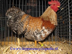 · Kleur en tekening van de haan Hals en zadelbehang, bovenrug, schouders en vleugelband warm roodachtig geel met lichtgrijze koekoektekening. Een lichtgrijze tint op de rug is toegestaan. Grote slagpennen: donker blauwgrijs, overdwars boogvormig onderbroken door licht blauwgrijze banden; bruine zweem is toegestaan. De buitenvaan van de kleine slagpennen die de vleugeldriehoek vormt is geelbruin en grijswit getekend Borst en buik: geel tot licht roodachtig met lichtere koekoektekening, een grijze zweem is toegestaan. Staart: donker blauwgrijs. overdwars boogvormig onderbroken door lichtgrijze banden, bruine zweem is toegestaan. Donskleur: grijs. · Kleur en tekening van de hen Halsbevedering goudgeel met zwarte schachtstreep die door een flauwe, lichtgrijze koekoektekening onderbroken wordt. Lichaamsbevedering licht roodpatrijs met vlokachtige koekoektekening die op de vleugels als lichte toeptekening kan voorkomen. Geelachtige flittertekening is toegestaan . Borst: roodachtig geel. Donskleur: grijs. ü Ernstige fouten bij de haan Een koekoek gekleurde en getekende borst- en buikbevedering; ontbrekende geelrode kleur in de lichaamsbevedering; onvoldoende kleur en tekening in de vleugeldriehoek. ü Ernstige fouten bij de hen Overheersend grijze kleur in de lichaamsbevedering, zwarte bovennekbevedering, anders dan roodachtig gele borstbevedering. o Fouten bij haan en hen Geringe afwijkingen in kleurdiepte en tekening. |