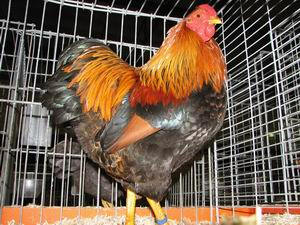 · Kleur en tekening van de haan Kop: oranjerood. Hals: halsbehang warm oranje-goudgeel, iedere veer met een glanzende, groenzwarte schachtstreep, bijna evenwijdig lopende aan de veerrand; de schachtstreep eindigt dicht bij het einde van de veer in een punt; schacht zwart; veren aan de voorzijde van de hals zwart. Schouders: karmijnrood. Rug en zadel: rug karmijnrood; zadelbehang warm oranje-goudgeel, iedere veer met schachtstreep zoals in het halsbehang. Een iets diepere tint in het zadelbehang dan in het halsbehang is toegestaan, doch een zo groot mogelijke gelijkheid in kleurdiepte bij beide veergroepen is gewenst; schacht zwart. Staart: stuurveren zwart; sikkels, kleine sikkels en staartdekveren: groenglanzend zwart; kleine staartdekveren groenglanzend zwart, warm oranje-goudgeel gerand. Vleugels: boeg zwart; vleugelband groenglanzend zwart, bij gesloten vleugel een dwarsband vormende; grote slagpennen zwart met diep roodbruin randje langs buitenkant van de buitenvaan; kleine slagpennen zwart met diep roodbruine zoom langs de buitenvaan; zodat een roodbruine vleugeldriehoek gevormd wordt. De veer eindigt in groenachtig zwart. Borst: groenglanzend zwart; enige bruine tekening toegestaan. Buik, achterlijf en benedendijen: zwart, enige bruine tekening in dijen toegestaan. Donskleur van alle veergroepen: grijsachtig. · Kleur en tekening van de hen Kop: diep geelbruinachtig oranje. Hals: halskraag oranjegeel, beginnende ongeveer bij de overgang van kop en hals, iedere veer voorzien van een brede groenachtig glanzende zwarte schachtstreep (licht getekend met oranjebruin), evenwijdig lopende met de veerrand en eindigende in een punt dichtbij het veereinde. Voorzijde van de hals getekend als de borst. Rug: warm grijsachtig geelbruin, scherp getekend met zwarte meervoudige zoomtekening, de ligging evenwijdig lopend aan elkaar en aan de veeromtrek. Staart: stuurveren zwart, de beide bovenste veren zwart met warm grijsbruine tekening; staartdekveren en zadelkussenveren warm grijsachtig geelbruin en getekend zoals de rugveren. Vleugels: grote slagpennen zwart met een bruine rand aan de buitenvaan; kleine slagpennen binnenvaan zwart, buitenvaan bruin met zwarte zoomstreepjes ongeveer evenwijdig lopende aan de veeromtrek; vleugeldekveren warm grijsachtig bruingeel, getekend zoals de rugveren. Borst: warm, grijsachtig geelbruin en getekend zoals de rugveren. De tekening van de borstveren loopt door tot aan de keel. Buik en benedendijen: zacht grijsachtig geelbruin met zwarte zoomtekening. Achterlijf: zacht grijsbruin. Donskleur van alle veergroepen: grijsachtig. ü Ernstige fouten bij de haan Wit in sikkels, staart- en vleugelpennen; aanmerkelijk te roodbruine of grauwgele grondkleur; te donkere kleur in hals- en zadelbehang of te flauwe schachtstreeptekening. ü Ernstige fouten bij de hen Te zwakke of onjuiste tekening in de veren van borst, vleugeldek en rug; roestkleur op vleugels; gepeperde tekening in plaats van duidelijke zoomtekening. o Fouten bij de haan Bovenstaande fouten in mindere mate voorkomend, bovendien te lichte en onvolledig gekleurde vleugeldriehoek. |