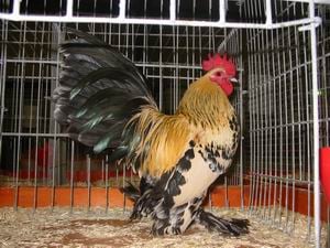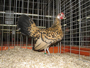 Noot Naarmate de dieren van de porseleinkleurslag varianten ouder worden, zal de hoeveelheid wit in het tekeningpatroon toenemen. Dieren van twee jaar oud hebben doorgaans de beste kleurverdeling. Kleur en tekening van haan en hen De okerbruine grondkleur van porselein is hier vervangen door citroengeel. De zwarte en witte tekening stemt geheel overeen met die van porselein. Donskleur: alle driekleurige veergroepen blauwgrijs, overgaande in grauwachtig lichtgeel aan de basis. Ernstige fouten bij haan en hen Fletse of ongelijke grondkleur; te warme, op okerkleur gelijkende grondkleur; te sterke ontwikkeling van de zwarte lovertekening in de borst van de haan; te weinig tekening in de borstveren; grove witte pareltekening; geheel verwaterde tekening; te veel wit in de vleugelpennen; schachtstreeptekening in hals. o Fouten bij haan en hen Iets te fletse of iets ongelijke grondkleur; iets te warme en daardoor niet van de okerkleur verschillende grondkleur; iets te veel wit bij overjarige en oudere dieren; Iets te veel wit in de vleugelpennen. |