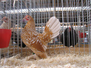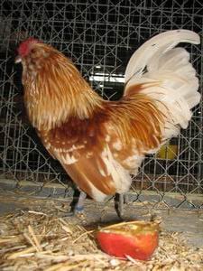Noot: Naarmate de dieren van de porseleinkleurslag varianten ouder worden, zal de hoeveelheid wit in het tekeningpatroon toenemen. Dieren van twee jaar oud hebben doorgaans de beste kleurverdeling. · Kleur en tekening van haan en hen Deze kleurslag heeft een midden okerbruine grondkleur. Het zwart van de porseleinkleur heeft plaats gemaakt voor wit, zodat de witte parels zijn vergroot tot witte lovers ter grootte van de zwarte lover en de witte eindstip van de porseleinkleurige tezamen . De staartstuurveren zijn geheel wit, zo ook de sikkelveren en staartdekveren van de haan. Donskleur: van alle tweekleurige veergroepen licht geelachtig. ü Ernstige fouten bij haan en hen Grove en onregelmatige witte lovertekening; onscherpe aftekening; te veel wit in de borst en onvoldoende lovertekening in hals- en zadelbehang bij de haan; te weinig lovertekening in de borst bij de hen; te lichte of ongelijkmatige grondkleur. o Fouten bij haan en hen Iets grove of iets onregelmatige lovertekening; onregelmatige grondkleur; zwarte kleurspatten in de witte lovers. |