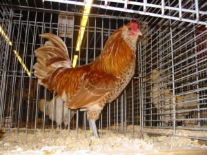 · Kleur en tekening van haan en hen De grondkleur is bij deze kleurslag warm goudgeel behalve in de sierveren, waar de kleur iets donkerder is. De tekening is in alle delen van het gevederte geheel gelijk aan die van goud zwartgeloverd, doch de kleur van de tekening is bij deze kleurslag wit in plaats van zwart. Donskleur: wit. ü Ernstige fouten bij haan en hen Te lichte, te donkere of geheel ongelijke grondkleur; te zware of te kleine of hoefijzervormige tekening. Ontbreken of nagenoeg ontbreken van de lovertekening in hals- en zadelbehang bij de haan en ontbreken van duidelijke banden over de vleugels bij de hen. o Fouten bij haan en hen Bovenstaande ernstige fouten in mindere mate aanwezig. |