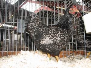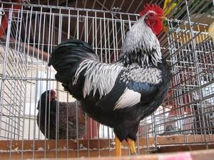 · Kleur en tekening van haan en hen De veren vertonen hetzelfde tekeningspatroon als bij dubbelgezoomd. De zwarte kleur is in alle veergroepen van haan en hen geheel overeenkomstig als die bij dubbelgezoomd. Overal waar bij dubbelgezoomd de kleur bruin of een variant hiervan genoemd wordt, is dit bij de haan vervangen door zilverwit en bij de hen door zilvergrijs. Donskleur: grijsachtig. ü Ernstige fouten bij de haan Rode of diep gele tint op schouders, hals- en zadeltekening of in de slagpennen. Wit in sikkels en staart. Te veel wit in hals- en zadelbehang. Het ontbreken van de tekening in hals en zadel, rug- en schouderveren zowel aan de voor- als aan de achterkant van de veer waarvan de buitenste omzoming zwart moet zijn. Het ontbreken van de witte tekening in de grote en kleine slagpennen. Veel wit in borst. ü Ernstige fouten bij de hen Te roestige of te grauwbruine grondkleur. Te zware, onregelmatige, niet geheel omlopende buitenste omzoming. Het ontbreken van de binnenzoom. Sterke pepering in de grondkleur. o Fouten bij de haan Iets gele tint op schouders. Iets wit in borst-, buik-, en dijbevedering. Veel zwart in hals- en zadelbehang. Geringe schimmel in slagpennen. Weinig tekening in hals en zadel, rug- en schouderveren. Weinig witte tekening in de grote en kleine slagpennen. Zoomtekening in de vleugelband. o Fouten bij de hen Iets gele tint in vleugelband en/of vleugelboeg. Grondkleur te grijsachtig. De overige ernstige fouten in mindere mate voorkomend. |