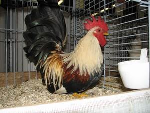· Kleur en tekening van de haan Kop: licht strogeel. Hals: halsbehang licht strogeel met smalle zilverkleurige omzoming. Schouders en rug: oranjegeel. Zadel: zadelbehang lichtgeel. Staart: stuurveren zwart: sikkels, bijsikkels en staartdekveren groenglanzend zwart. Vleugels: boeg zwart. Vleugelband groenglanzend zwart. Grote slagpennen: zwart met een smal strogeel randje langs de buitenvaan. Kleine slagpennen: binnenvaan zwart, buitenvaan geelachtig zilver, zodat bij gesloten vleugel een geelachtig zilverkleurige vleugeldriehoek gevormd wordt. Borst, buik, achterlijf en dijen: groenglanzend zwart. Donskleur: grijsachtig crème. · Kleur en tekening van de hen Kop meelwit Hals: halskraag licht goudbruin met zilverkleurige omzoming. Iets dofzwarte kleurspatten in het onderste gedeelte ervan is toegestaan maar geniet niet de voorkeur. Rug en schouders: tarwekleurig wit of meelwit met enigszins lichtbruine gloed. Benedenrug en zadel: meelwit. Staart: asgrauw met licht bruinachtige tekening. Borst, buik, achterlijf en benedendijen: roomkleurig wit. Grote en kleine slagpennen: buitenvaan lichttarwe, binnenvaan licht tarwegrijs met licht bruinzwarte stippen. Donskleur: wit tot crèmeachtig. ü Ernstige fouten bij haan en hen Sterk ongelijkmatige bovenkleur o Fouten bij haan en hen Iets ongelijkmatige of iets te donkere of iets te lichte grondkleur: duidelijk zichtbare halstekening; lichte halskleur. |