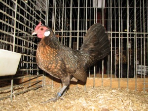 · Kleur en tekening van de haan Kop: donker roodbruin. Hals: halsbehang diep oranjerood; iedere veer met een krachtige groenglanzend zwarte schachtstreep, bijna evenwijdig lopende aan de veerrand; de schachtstreep eindigt dicht bij het einde van de veer in een punt; nerf zwart; veren aan de voorzijde van de hals zwart. Schouders: donker roodbruin. Rug: donker roodbruin. Zadel: zadelbehang diep oranjerood met schachtstreeptekening. Staart: stuurveren zwart, sikkels, bijsikkels en staartdekveren groenglanzend zwart Vleugels: boeg zwart; vleugelband groenglanzend zwart, bij gesloten vleugel eer duidelijke band dwars over de veer vormend. Grote slagpennen: zwart, behoudens de buitenvaan die een bruin randje heeft. Kleine slagpennen: binnenvaan zwart, buitenvaan donkerbruin, zodat bij gesloten vleugel een donkerbruine vleugeldriehoek wordt gevormd. Borst: groenglanzend zwart. Buik, achterlijf en dijen: zwart. Donskleur van alle veergroepen: grijsachtig. · Kleur en tekening van de hen Kop: roodbruin. Hals: halskraagveren van boven roodoranje, gaat naar onderen over in donkeroranje met krachtige zwarte schachtstreeptekening, evenwijdig lopende aan de veerrand; de schachtstreep eindigt dicht bij het einde van de veer in een punt. Schouders: schouderveren roodachtig bruin, met aan de veerrand een smal zgn. franje-randje, tegen welk randje de zwarte pepering opeengehoopt zit en er als het ware een halvemaanvormige, onscherpe donkere tekening op de veren ligt. De lichtere nerf steekt duidelijk af tegen de donkere veerkleur. Rug, zadel en staartdekveren: gelijk aan de schouders. Staart: stuurveren zwart, behalve de bovenste veren die gelijk zijn aan de staartdekveren . Vleugels: boeg en vleugeldekveren gelijk aan de schouders. Grote slagpennen: zwart Kleine slagpennen: binnenvaan zwart, buitenvaan roodachtig bruin met zwarte pepering. Voorzijde van de hals zalmkleurig. Borst: zalmkleurig. Buik en dijen: iets minder donker van kleur en tekening dan de vleugeldekveren. Achterlijf: roodachtig bruin, in het donsgevederte iets grijsachtig. Donskleur van alle veergroepen: grijsachtig. ü Ernstige fouten bij de haan Veel te lichte kleur in hals- en zadelbehang; veel te zwakke schachtstreeptekening; doorbroken schachtstreeptekening. ü Ernstige fouten bij de hen Veel te lichte kleur van de borst; veel te lichte kleur van de vleugeldek-, schouder-, rug-, zadel- en staartdekveren en het ontbreken van de halvemaanvormige kleuropeenhoping. Veel te lichte kleur van de halskraag of het ontbreken van de schachtstreeptekening in de halskraagveren; doorbroken schachtstreeptekening. o Fouten bij haan en hen Dezelfde afwijkingen, doch in minder sterke mate aanwezig. Bovendien bij de haan onvolledig gekleurde vleugeldriehoek. |