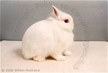 Alleen in de kleur wit. De granharen van de pels moeten zo stevig mogelijk zijn, de bij- en wolharen zullen zeer talrijk moeten zijn om deze granharen te ondersteunen, waardoor de pels in een bepaalde stand blijft staan. De ideale pelsconditie bij het tentoonstellingsdier is een geheel doorgehaarde pels, zonder dun behaard of kaal plekje. De verharing herkent men duidelijk aan het oude, afstervende en het nieuw groeiende haar is zichtbaar en te onderscheiden. Niet enkele in 't rond vliegende haren, maar flink loslatend haar is als verharing te beschouwen. De pels moet vol gehaard zijn. De haren zijn aan de wortel enigszins fijn, naar boven dikker wordend, om in de punten weer fijner te eindigen. De beharing mag niet golvend zijn en geen wollig aanzien geven. De pels moet veel onderwol bevatten, om de dekharen te steunen, zodat deze niet plat op het lichaam komen te liggen. Bij de beoordeling mogen de grannen niet verder voorover vallen dan horizontaal, hoe schuiner deze haren blijven staan hoe beter de kwaliteit is, vallen deze haren verder dan horizontaal dan is de granbeharing te slap. De hoofdwaarde van deze pels ligt in de dichtheid, de structuur en de lengte van de beharing. De haren moeten 3-5 cm lang zijn en fraai glanzend. De kop en benen zijn iets langer behaard. De buikbeharing is korter dan op het dek en moeten gelijkmatig in verticale lijn staan. De kleur is zuiver wit, vrij van ivoorkleur of gele aanslag. De oogkleur is rood. De nagels moeten kleurloos zijn. Granharen wil zeggen de haren die boven het onderhaar uitsteken. Als men tegen het haar in strijkt, dan moet hij weer langzaam terug in oude positie gaan en een beetje stug aanvoelen. Dan heb je de perfecte pels, men moet de granharen kunnen voelen. (granharen = grannen) |