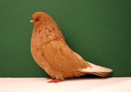 Middelgrote, compacte duif. Laag; opgerichte houding. Relatief groot, van opzij gezien rond, hoogste punt boven de ogen; breed, boven de neusdoppen iets naar voren uitgebogen voorhoofd, de schedel vervolgens vloeiend in de nek overgaand; sprekende wangen; ongekapt of met brede verrijke schelpkap, met of zonder rozetten, gescheiden van de nekbevedering. In het midden van de kop, parelkleurige iris met kleine pupil. Smal en rood. Middellang, fijn, spits uitlopend, recht ingestoken; vleeskleurig, in het achterste deel goed doorbloed. Kort en dik. Breed, vol, goed gerond, licht opgetrokken gedragen. Breed in de schouders, naar achteren versmallend, afhellend. Tot voor het staarteinde reikend; vleugeldracht normaal. Staartdracht normaal. Kort, nagels licht. Aanliggend. |