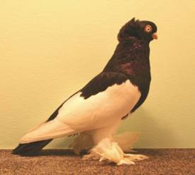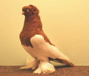 Fouten: Lang of slank lichaam, smalle borst; platte kop, te smal voorhoofd; sterk rode iris; te lange, korte of dunne snavel; rode iris; gebrekkige kap; ongelijkmatig geplaatste of ontbrekende rozetten; te korte of sterk onderbroken voet- en dijbeenbevedering; gebrekkige kleur en tekening. Beoordeling: ü Algemeen voorkomen ü Type en stand ü Kop, kap en snavel ü Oogkleur ü Voetbevedering ü Kleur en tekening Ringmaat: 9 mm. |