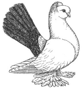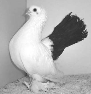 Fouten: Smal of lang lichaam; hoge stand; te nauwe beenstand; ontbrekende sidderhals; smalle staart, slecht gesloten staart, te lage staartdracht; minder dan 14 staartpennen; vlak voorhoofd; te lange snavel; smalle, veerarme of onregelmatige kap; weinig ontwikkelde voetbevedering en gierhakken; schimmel in de staart, bijna geheel witte kiel. Beoordeling: ü Algemeen voorkomen ü Type en stand ü Staart en staartdracht (postuur) ü Kop en hals (sidderen) ü Voetbevedering ü Kleur en tekening Ringmaat: 10 mm. |