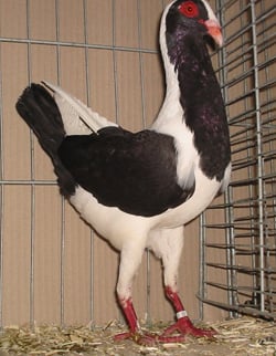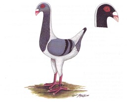 Fouten: Te klein of te smal lichaam; te lage stand; platte schedel, onderbroeken snavel – kop belijning; dunne snavel; lichte of te smalle oogranden; lange of afhellende rug; laag gedragen staart; schimmel in de staart; matte kleur; ernstige tekeningfouten. Bijwerken / conditioneren: De witte koptekening mag matig zichtbaar worden bijgewerkt vanaf de neusdoppen tot aan de achterkop. Er mag geen direct zichtbare kale plek aanwezig zijn. Beoordeling: ü Algemeen voorkomen ü Type ü Kop en snavel ü Stand ü Tekening ü Kleur Ringmaat: 9 mm. |