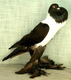 Fouten: Plomp lichaam, klein lichaam; te vlakke stand; te weinig actie; korte hals; scheve, plompe of kogelvormige ballon; te breed of te nauw staande benen, korte, X-vormige of slecht bevederde benen; te grote slab, sterk gekleurde borst en buik, witte slag- of staartpennen laatste uitge-zonderd witstaart); slechte kleur; onzuivere banden of schubtekening. Beoordeling: ü Algemeen voorkomen ü Type en stand en grootte ü Hals- en beenlengte ü Actie ü Ballon ü Kleur en tekening ü Voetbevedering ü Oog- en snavelkleur Ringmaat: 11 mm. |
