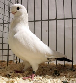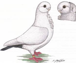 Fouten: Lang en smal lichaam; hangvleugels; smalle of heel vlakke voorkop; kneep; sterk buiten de profiellijn uitstekende snavel; te weinig snavelsubstantie; te smalle snavelaanzet; ontbrekende jabot of wam; rode oogranden; slecht gevormde kap. Beoordeling: ü Algemeen voorkomen ü Type, stand en houding ü Kop en snavel ü Jabot ü Kleur en tekening. Ringmaat: 8 mm. |