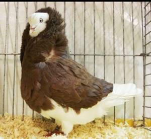 Middelgrote duif. Middelhoog; horizontale houding. Middellang, breed en goed afgerond met iets voorhoofdsvulling; op het achterhoofd een brede kap. Iris parelkleurig, enige rode adering is toegestaan. Rood, fijn en éénrijig. Middellang; blank, nabij de snavelbasis meer roodachtig. Fijn. Middellang, gestrekt, bij de borst krachtig. Goed uitgesneden. Breed en diep, duidelijk naar voren tredend. Breed tussen de schouders, wigvormig. Niet voorbij het staarteinde reikend. Tamelijk kort, vrij smal, goed gesloten en horizontaal gedragen. Middellang en krachtig. Kap: Hoog aangezet, rechtop staand, breed en regelmatig. Kraag: Zonder onderbreking op de kap aansluitend en doorlopend tot op de schouders. De kraagveren afstaand van de wangen, van terzijde gezien ten hoogste tot aan de ogen reikend; beide zijden mogen elkaar op de hals niet raken. Nekvulling: Goed gesloten, breed en vol bevederd. Op de hals aan weerszijden een ovale rozet, zo laag mogelijk aangezet. |