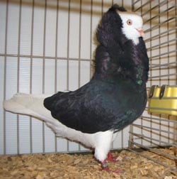 Fouten: Te klein; te lang of plomp type; gedrukte of afhellende stand; neiging tot blazen; twee rozetten aan één zijde; vooroverhellende kap; onregelmatige of onderbroken kraag; kraag aan de voorzijde te gesloten; aangelopen snavel; koptekening vast aan één of beide ogen; minder dan 7 of meer dan 12 aaneengesloten witte buitenste pennen; gekleurde veren aan de buik, voor en/of aan de benen. Beoordeling: ü Algemeen voorkomen ü Type ü Stand ü Hals- en beenlengte ü Kap en kraagverloop ü Nekvulling en rozetten ü Kleur en tekening ü Ogen en oogranden Ringmaat: 8 mm. |