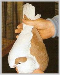 Fouten: Smal type; te hoge stand; sterk opgerichte houding; te lange helm; te brede witte rand boven oog; sterk afwijkende vleugeltekening; bleke oogrand; ernstig aangelopen bovensnavel bij blauw en zwart. Beoordeling: ü Algemeen voorkomen ü Type en stand ü Koptekening ü Oog- en/of snavelkleur ü Kleur en tekening Ringmaat: 9 mm. Versierselen: Bij doffers is het aanbrengen van originele versierselen op de wijze , zoals in het land van herkomst toegestaan (Culturele uiting). De NBS-ring moet zichtbaar blijven. |