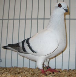 Kleur en tekening: De bevedering gelijkmatig ijskleurig. Het dons (onderkleur) donker blauwgrijs, het duidelijkst aan hals en borst, het minst aan de buik en bij de aars. In ruststand moet de duif egaal ijskleurig lijken; in beweging schijnt de donkere onderkleur door. Het vleugelpatroon zwart; vleugelbanden niet te smal; kraspatroon regelmatig, bij voorkeur driehoekig, de verhouding patroonkleur tot grondkleur = 5 : 3; de staartband zwart en achter de staartband nog een lichte zoom. Bij een zuivere gelijkmatige bovenkleur lijkt de rug veelal wit. Slagpennen donker. |