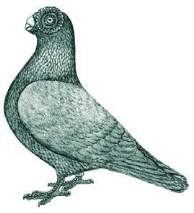Middelgroot, compact type. Laag; licht afhellende houding. Kort en breed, bijna dubbelsteenwormig met afgeronde kanten. Bij jonge dieren en duivinnen tussen snavel en voorhoofd een geringe hoek, bij oude doffers is deze plek door ontwikkeling van de neusdoppen afgedekt, hetgeen een wat meer afgeronde kop laat zien. De kop voor en achter even breed. Zowel ongekapt als met brede schelpkap. Groot en levendig; bij oudere dieren wordt parelkleurige iris nagestreefd, desondanks worden aan de oogkleur geen hoge eisen gesteld. Bij wit en bonte dieren zijn donkere ogen toegestaan. Bij voorkeur groot, gelijkmatig rond, fijne structuur en bloedrood. Ze bestaan uit 2 tot 3 concentrische ringen, waarvan naar de buitenste toe de grootte en structuur toeneemt. Bij oude doffers kunnen de oogranden boven de kop uitkomen. Krap middellang, stomp en dik van voren gezien een driehoek vormend, de snavel goed gesloten; boven en ondersnavel even dik. Bij alle kleurslagen hoornkleurig; snavelstip is toegestaan. Licht opgeblazen, driehoekig, wit tot rossig, de bovensnavel tot het midden bedekkend, aan de zijkanten tot over de ondersnavel hangend; gelijkmatige, licht korrelige structuur, bijna glad, zonder sterke hobbels of holtes. Aan de onder-snavel drie rode wratten, één in het midden en één aan elke snavelhoek. Bij toenemende leeftijd worden deze wratten groter en vormen geleidelijk aan van snavelhoek tot snavelhoek een rode band. Vol uit het lichaam komend, naar boven toe dunner wordend en niet te lang. Goed uitgesneden. Breed, licht gerond en opgetrokken. Tussen de schouders breed, naar achteren wat versmallend; brede stuit en rijkelijk bevederd. Breed; lang, goed gesloten, bijna tot staarteinde reikend; vleugeldracht normaal. Brede veren en lang; staartdracht normaal. Kort en krachtig; of kaal of bekousd met zichtbare nagels en teenpunten. Glad aanliggend. |