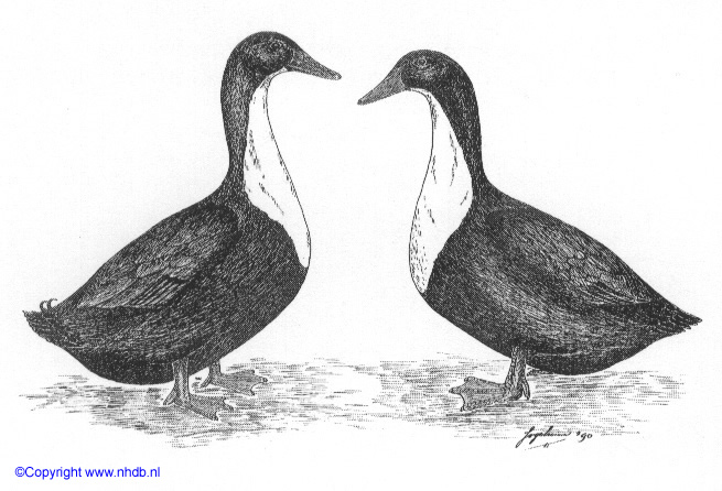 eend: zwart; snavelnagel bij beide geslachten: zwart. Ernstige fouten: Zeer onregelmatige begrenzing van de borstvlek; veel zwarte veren in het witte gedeelte; te sterk op de wangen doorlopende witte bevedering; wit in enig ander gedeelte van de bevedering; sterk afwijkende snavel- en pootkleur. Fouten: Bovenstaande ernstige fouten in mindere mate voorkomend; te lichte snavelkleur bij de woerd. |