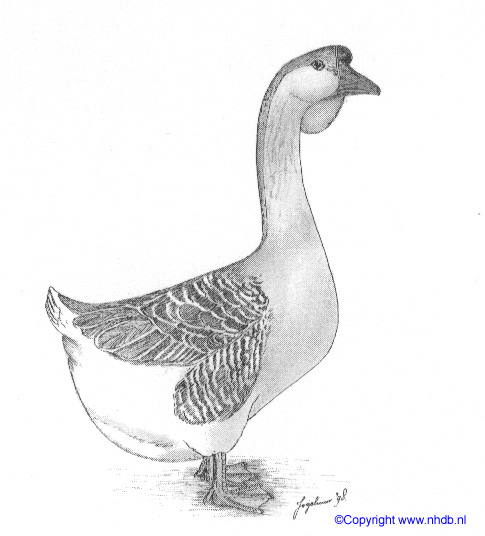 Grote, zware, vrij diep gestelde gans met een opgerichte houding.